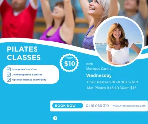 These Chair and Mat Pilates classes are lead by Wellness Coach Monique Carole. Each class includes gentle but powerful Pilates exercises and mindful movement specific to your needs. Focusing on controlled movements that bring stability, strength, and mobility to the entire body – enhancing core strength and rejuvenating both body and mind.